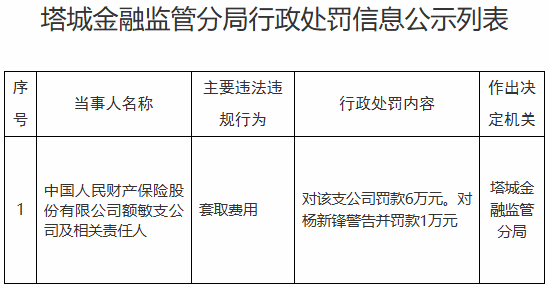 中国经济网北京1月20日讯 国家金融监督管理总局网站昨日公布的塔城金融监管分局行政处罚信息公示列表显示,中国人民财产保险股份有限公司额敏支公司及相关责任人套取费用。塔城金融监管分局对该支公司罚款6万元;对杨新锋警告并罚款1万元。
