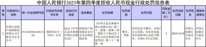 中国人民银行宁波市分行对人保财险宁波市北仑支公司下发的行政处罚决定书(甬银罚决字〔2025〕22号)显示,人保财险宁波市北仑支公司上述行为违反《中华人民共和国中国人民银行法》。