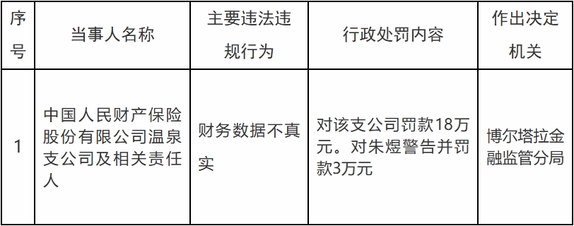 中国经济网北京1月30日讯 国家金融监督管理总局网站昨日发布博尔塔拉金融监管分局行政处罚信息公示列表。中国人民财产保险股份有限公司温泉支公司及相关责任人财务数据不真实。博尔塔拉金融监管分局对该支公司罚款18万元;对朱煜警告并罚款3万元。
