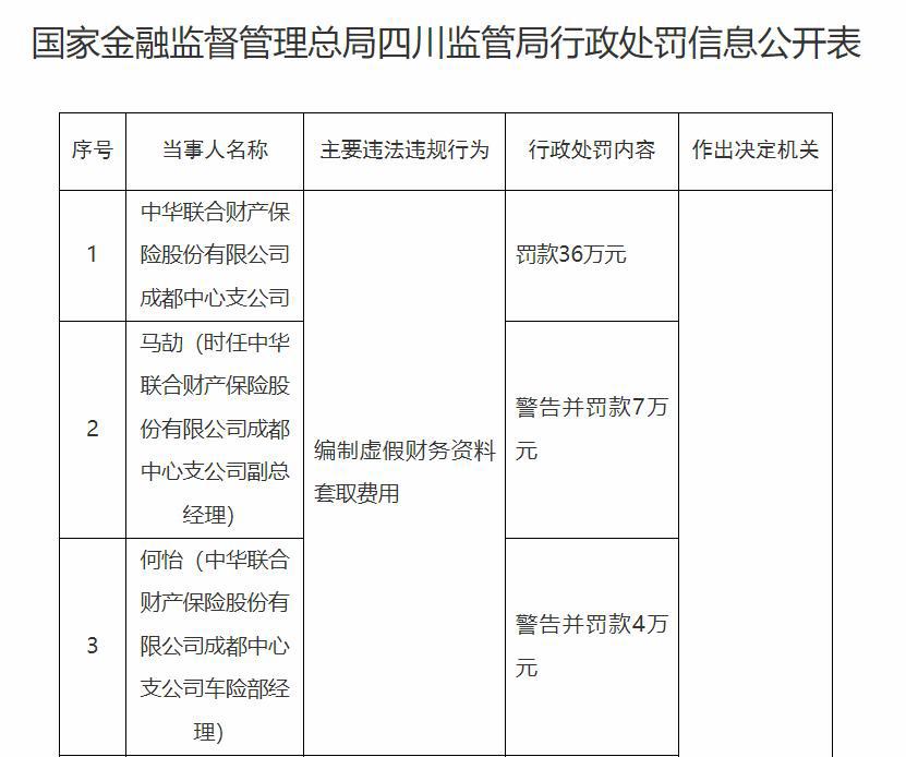 根据处罚信息,中华财险成都中心支公司因编制虚假财务资料套取费用,被罚款36万元;时任副总经理马劼被警告并罚款7万元,车险部经理何怡被警告并罚款4万元。
