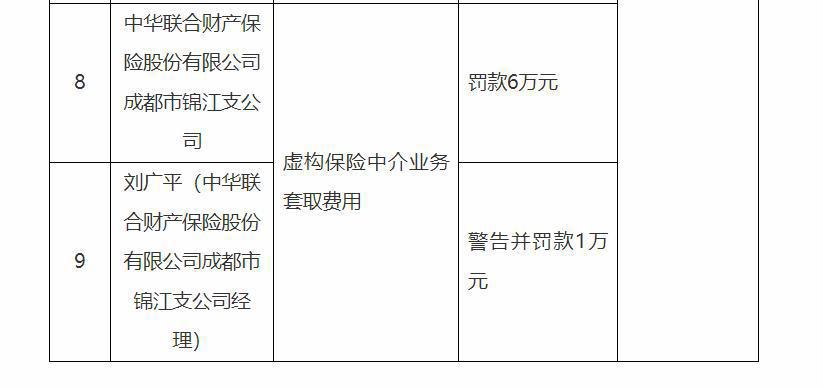 中华财险成都市锦江支公司因虚构保险中介业务套取费用,被罚款6万元;经理刘广平被警告并罚款1万元。