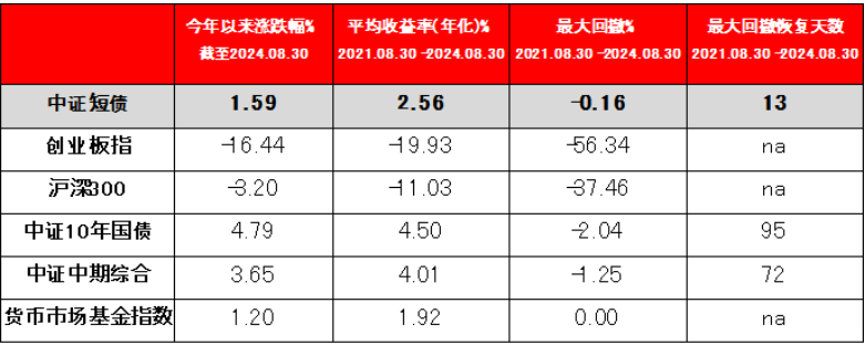 让我们用数据来证明。截至2024年8月30日,中证短债近3年平均年化收益率2.56%,而同期沪深300指数的平均年化收益率为-11.02%。从风险的角度看,中证短债近3年最大回撤-0.16%,最大回撤恢复时间13天;而同期,中证中期综合债指数及中证10年国债指数,最大回撤恢复时间分别为72天和95天(具体数据详见下表)。