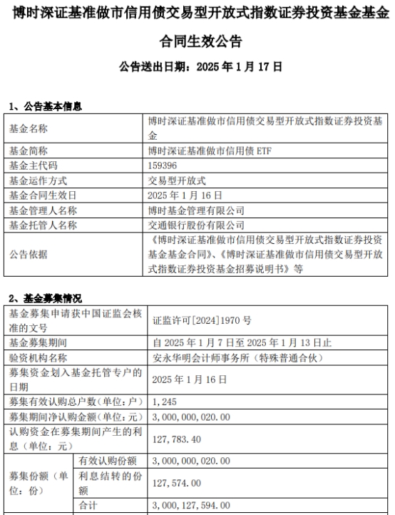 博时深证基准做市信用债ETF成立 募集金额30亿元