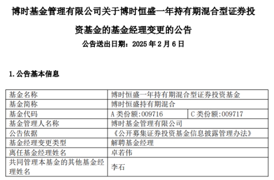 中国经济网北京2月6日讯 今日,博时基金管理有限公司公告称,卓若伟离任博时恒盛持有期混合(A类009716;C类009717)。
