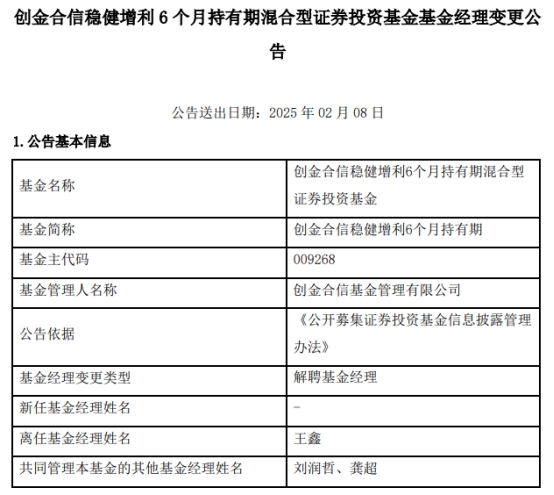 中国经济网北京2月10日讯 近日,创金合信基金管理有限公司公告称,王鑫离任创金合信稳健增利6个月持有期(A类009268;C类009269)。