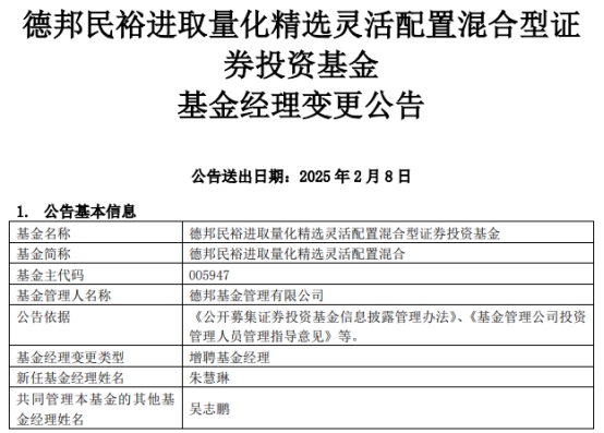 中国经济网北京2月10日讯 近日,德邦基金管理有限公司公告称,德邦民裕进取量化精选灵活配置混合(A类005947;C类005948)增聘基金经理朱慧琳。