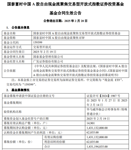 国泰富时中国A股自由现金流聚焦ETF成立 规模14亿元