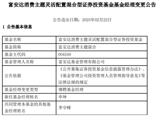 中国经济网北京2月24日讯 近日,富安达基金管理有限公司公告称,富安达消费主题混合(004549)增聘基金经理申坤。