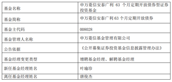 申万菱信安泰广利63个月定期开放债券增聘基金经理叶瑜珍。叶瑜珍2005年1月加入申万菱信基金管理有限公司,曾任风险分析师、信用分析师、基金经理助理,现任基金经理。