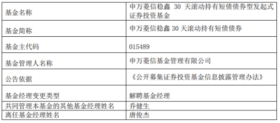 中国经济网北京2月25日讯 今日,申万菱信基金管理有限公司公告称,唐俊杰离任申万菱信安泰广利63个月定期开放债券(008028)、申万菱信鑫享稳健混合型发起式(A类015295;C类015296)、申万菱信双利混合(A类013634;C类013635)、申万菱信稳鑫30天滚动持有短债债券(A类015489;C类015490)。