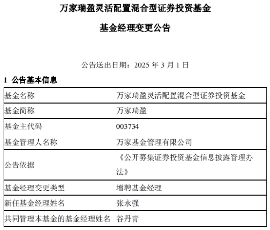 中国经济网北京3月3日讯 近日,万家基金管理有限公司公告称,万家瑞盈灵活配置混合(A类003734;C类003735)增聘基金经理张永强。
