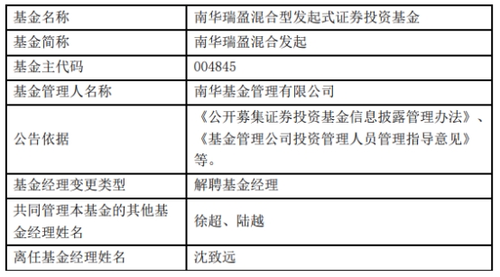 中国经济网北京3月3日讯 近日,南华基金管理有限公司公告称,沈致远离任南华瑞盈混合发起(A类004845;C类004846)。