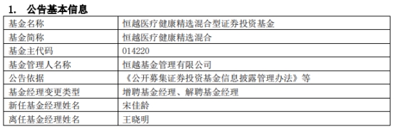 中国经济网北京3月3日讯 近日,恒越基金管理有限公司公告称,王晓明离任恒越内需驱动混合、恒越医疗健康精选混合(A类014220;C类014221),同时恒越医疗健康精选混合(A类010701;C类010702)增聘基金经理宋佳龄。