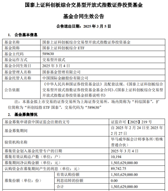 中国经济网北京3月5日讯 今日,国泰基金管理有限公司发布国泰上证科创板综合交易型开放式指数证券投资基金基金合同生效公告。