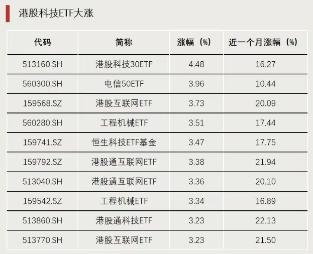 港股表现更加亮眼,港股恒生科技指数大涨4.02%,港股科技30ETF(513160)、港股互联网ETF(159568)等涨幅居前,成分股中中芯国际、小米集团、美团等涨幅超过5%。