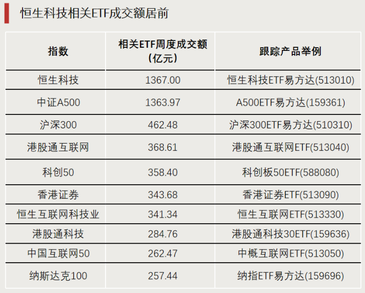 从成交额方面看,恒生科技指数相关ETF的周度成交额名列前茅,数据显示,其上周的成交额突破1360亿元。此外,A500ETF成交近期持续保持活跃,本周A500ETF易方达(159361)的周度成交额也居于单个产品前十。
