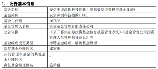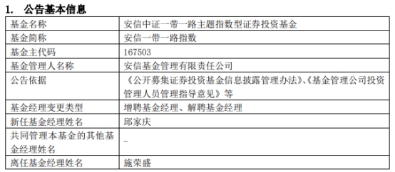 安信基金2只基金增聘邱家庆 施荣盛离任