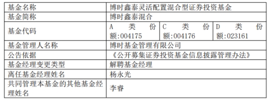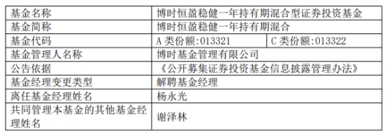 中国经济网北京3月13日讯 今日,博时基金管理有限公司公告称,杨永光离任博时恒盈稳健一年持有期混合(A类013321;C类013322)、博时平衡配置混合(050007)、博时新策略混合(A类001522;C类001523)、博时鑫泰混合(A类004175;C类004176;D类023161)。