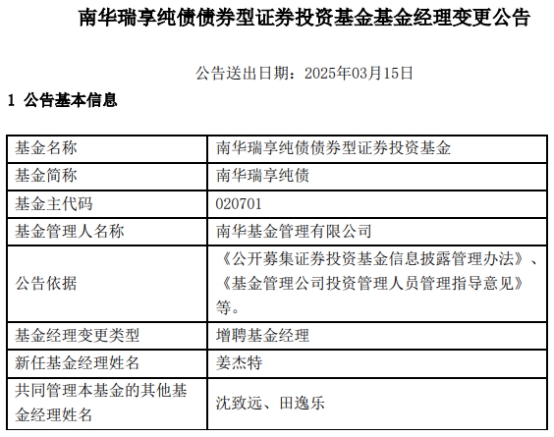 中国经济网北京3月17日讯 近日,南华基金管理有限公司公告称,南华瑞享纯债(A类020701;C类020702)增聘基金经理姜杰特。