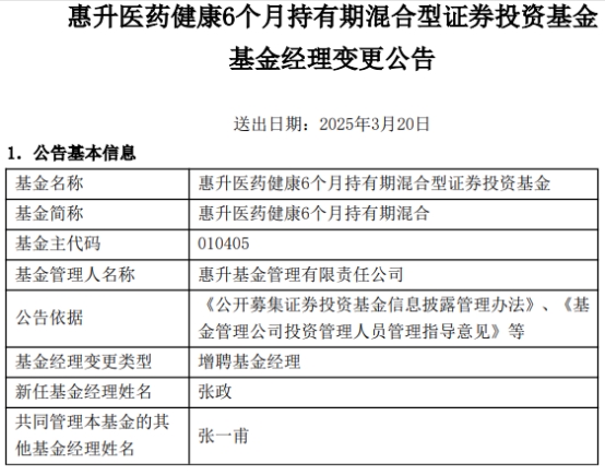 惠升医药健康6个月持有期混合增聘张政
