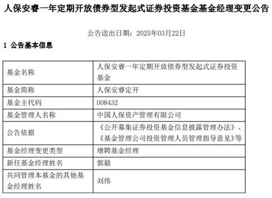 中国经济网北京3月24日讯 近日,中国人保资产管理有限公司公告称,人保安睿定开(008432)增聘郭毅。