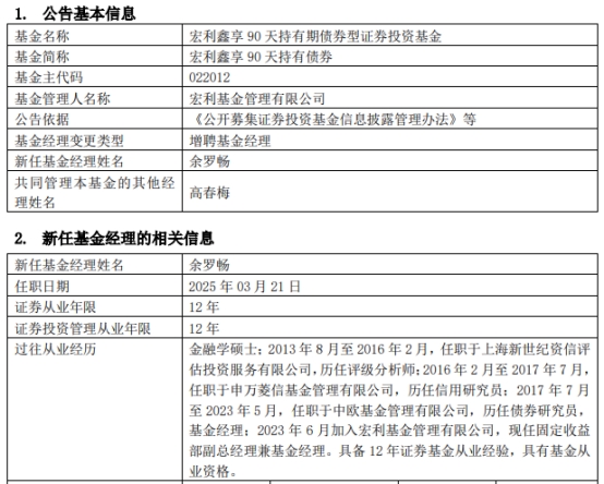 中国经济网北京3月24日讯 近日,宏利基金管理有限公司公告称,宏利鑫享90天持有债(A类022012;C类022013)增聘余罗畅。