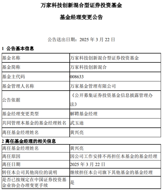 中国经济网北京3月24日讯 近日,万家基金管理有限公司公告称,黄兴亮离任万家科技创新混合(A类008633;C类008634)。