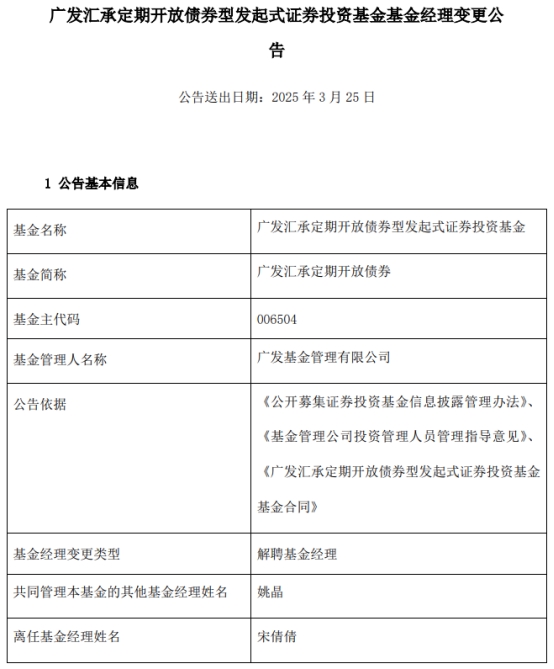 中国经济网北京3月25日讯 今日,广发基金管理有限公司公告称,宋倩倩离任广发汇承定期开放债券(006504)。