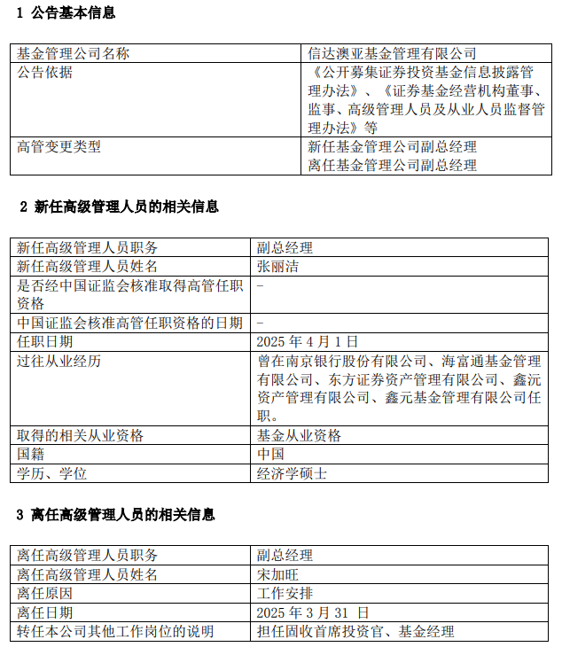 中国经济网北京4月2日讯 今日,信达澳亚基金管理有限公司发布高级管理人员变更的公告。公告称,公司副总经理宋加旺因工作安排于2025年3月31日离任,仍担任固收首席投资官、基金经理,张丽洁任副总经理。