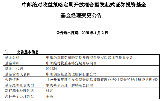 中邮绝对收益策略定期开放混合增聘姚艺 王高离任