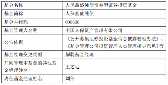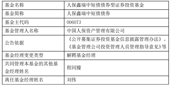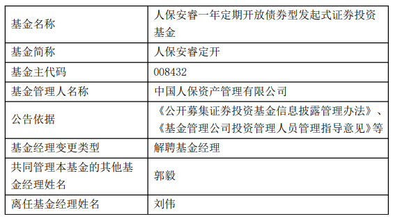 人保资产刘伟离任4只基金
