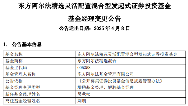 东方阿尔法精选混合刘明离任增聘吴秋松 成立7年亏2成