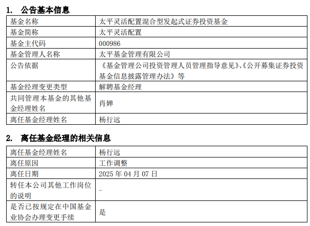 中国经济网北京4月9日讯 今日,太平基金管理有限公司公告称,杨行远离任太平灵活配置混合(000986)。