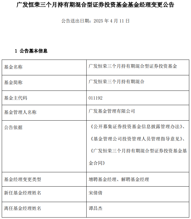 广发恒荣三个月持有期混合增聘宋倩倩 谭昌杰离任