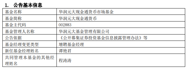 中国经济网北京4月14日讯 近日,华润元大基金管理有限公司公告称,华润元大现金通货币(A类002883;B类002884)增聘基金经理谭艳君。
