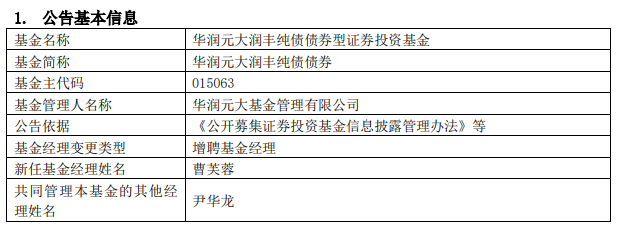 中国经济网北京4月14日讯 近日,华润元大基金管理有限公司公告称,华润元大润丰纯债债券(A类015063;C类015064;D类017586)增聘基金经理曹芙蓉。