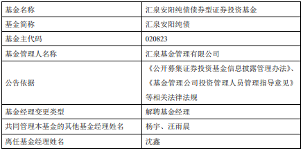 沈鑫离任汇泉安阳纯债基金