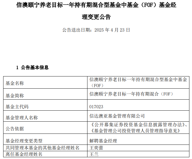 王兰离任信澳颐宁养老目标一年持有期混合(FOF)