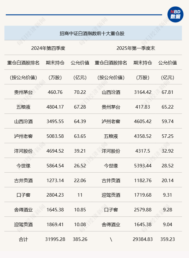 其中,作为酒类板块的老牌指数基金,招商中证白酒指数基金(即白酒基金LOF,161725)调仓幅度较大。截至一季度末,其前十大重仓共计持仓约2.94亿股,较上一季度末减少0.26亿股;持仓市值359.23亿元,较上一季度末的385.26亿元减少约26.03亿元。