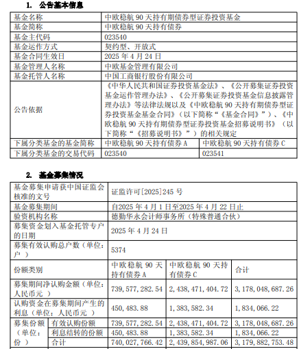 中国经济网北京4月25日讯 今日,中欧基金管理有限公司发布中欧稳航90天持有期债券型证券投资基金基金合同生效公告。