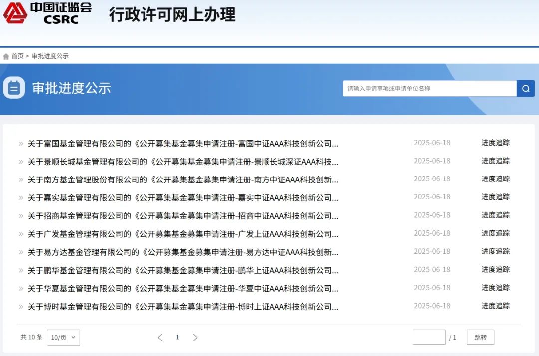 根据证监会官网,首批上报科创债ETF的10家公募基金公司分别是华夏、南方、富国、易方达、广发、博时、嘉实、鹏华、招商和景顺长城基金。从公募管理规模来看,这些公司均属于行业头部机构,其最新进度显示为“接收材料”。