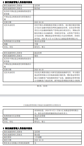 中国经济网北京6月23日讯 近日,汇泉基金公告,汇泉基金任命陈洪斌为总经理、任命柴玏为副总经理,原总经理梁永强离任。