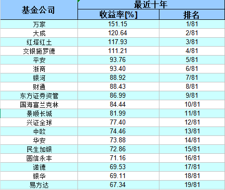 拉长时间看,受市场波动影响,公募机构权益投资能力差异明显。近十年来,万家、大成、红塔红土、交银施罗德等机构的权益类基金投资收益翻倍,业绩突出;还有平安、浙商、财通等公募机构权益类基金有着不错的表现。