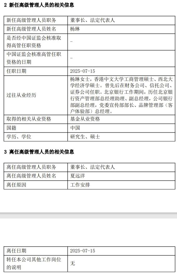 7月16日,中加基金发布高管变更公告,董事长夏远洋因工作安排于7月15日离任。同样有着北京银行工作履历的杨琳接任董事长职务。