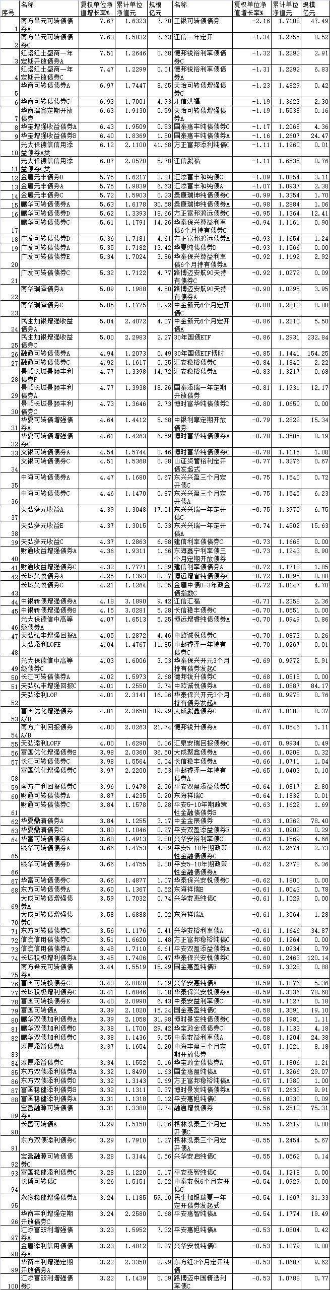 南方昌元可转债债券A、南方昌元可转债债券C、红塔红土盛商一年定期开放债券A、红塔红土盛商一年定期开放债券C以7.67%、7.63%、7.51%、7.47%位居涨幅前列。