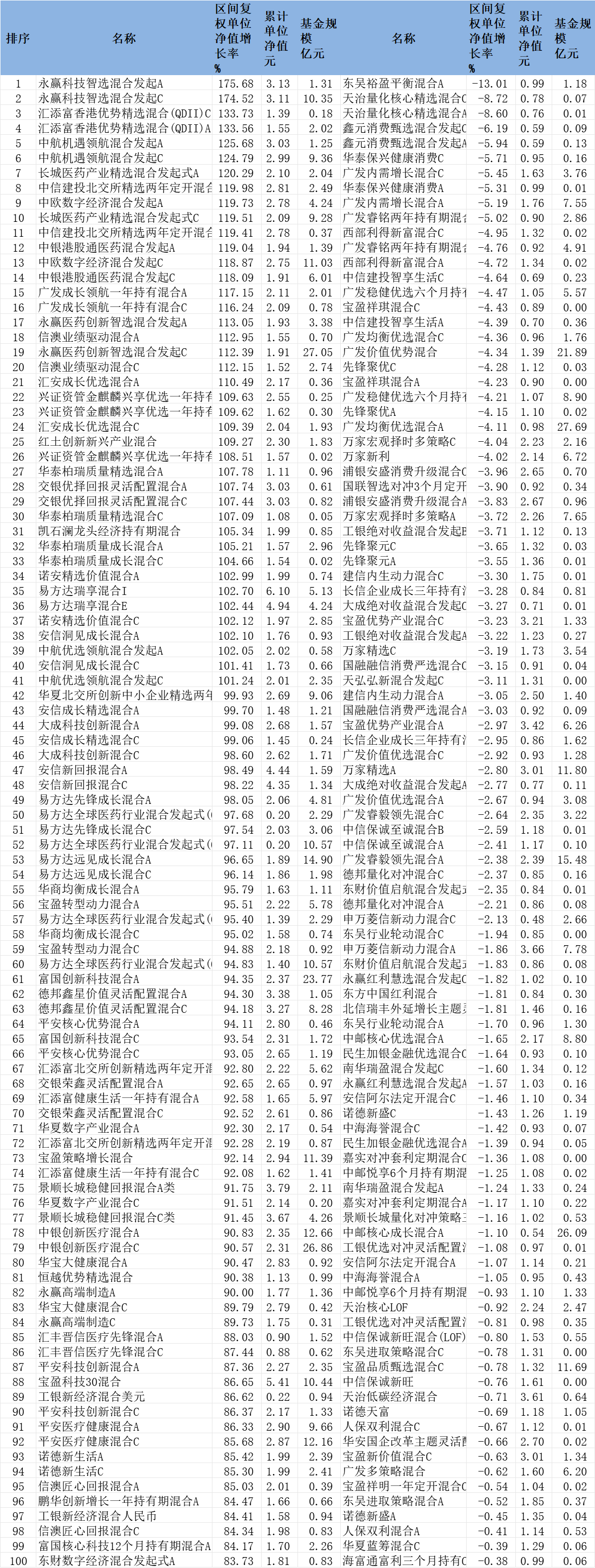 2025年前8月混合型基金涨跌幅前100名
