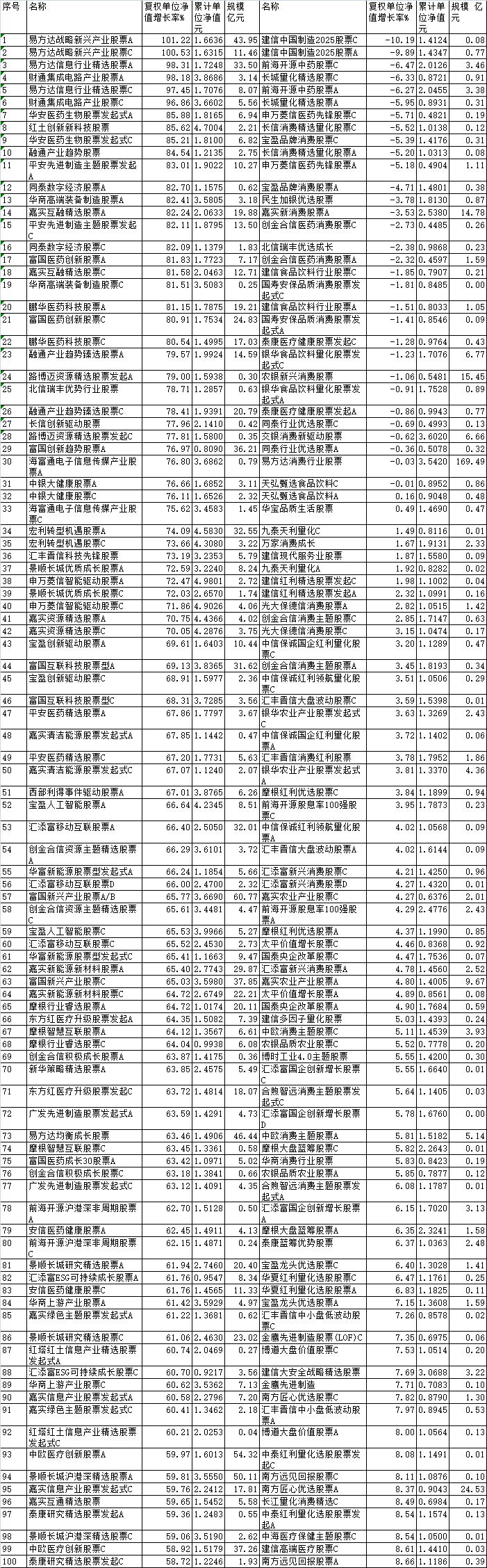 如重仓医药个股的前海开源中药股票C、前海开源中药股票A跌6.47%、6.27%,申万菱信医药先锋股票C、申万菱信医药先锋股票A也下跌了5.71%和5.18%。另外,重仓白酒股的长信消费精选量化股票C、A也下跌了5.52%、5.20%。