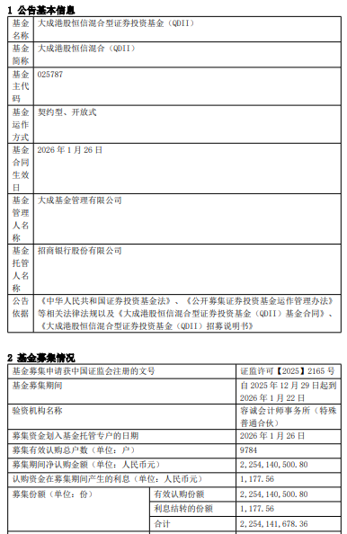 大成港股恒信混合QDII成立 规模22.5亿元