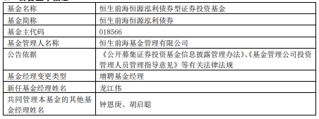 恒生前海恒源泓利债券增聘龙江伟