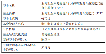 中国经济网北京128日讯 今日,浙江浙商证券资产管理有限公司公告,浙商汇金卓越配置一年持有混合(FOF)、浙商汇金卓越稳健3个月持有混合发起式(FOF)增聘陈正声。